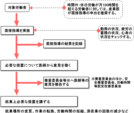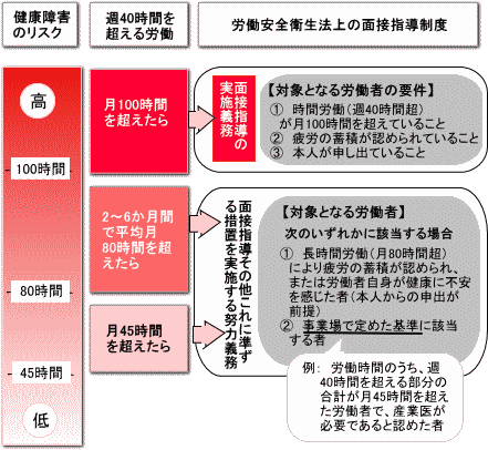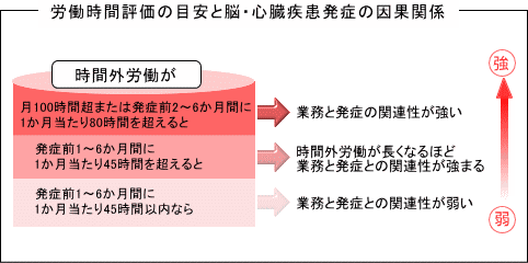 働きすぎ・働かせすぎによる健康障害の防止対策 育児・介護休業法改正 近年、長時間労働や仕事のストレスによって、過重な負荷がかかり、脳・ 心臓疾患やうつ病を発症するケースが多くみられ、心身ともに働きすぎによ る健康障害の問題が深刻化しています。 ここ数年の過労死・過労自殺事案に関する労災の請求件数は、増加傾向を 示しています。 厚生労働省では、「過重労働による健康障害防止のための総合対策」(平成 18年3月17日基発第0317008号)を策定し、その中で、事業者が構ずべき措置 を示しています。 過重労働による健康障害防止のための総合対策 この総合対策は、脳・心臓疾患に係る労災認定基準で下図の労働時間の 評価の目安が示されたことなどを受けて、平成14年2月に過重労働による 健康障害を未然に防止するための対策・措置を定めていました。 その後、平成18年4月に施行された改正労働安全衛生法に長時間労働者 の面接指導制度が創設されたことなどに伴い、新たな総合対策として現在の 内容となったものです。