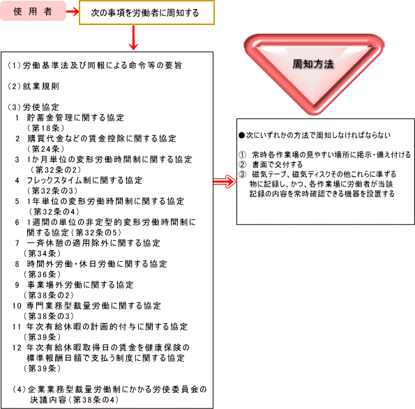 法令の要旨、就業規則、各種労使協定などを掲示、備付け、書面の交付などに